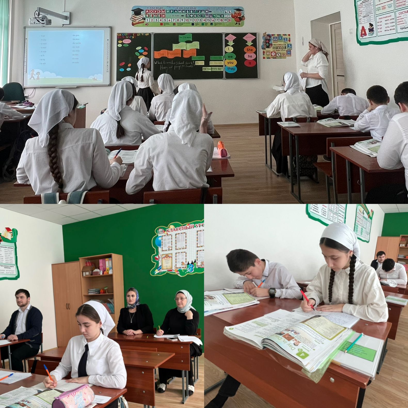Члены методического объединения Гиназова Л.Х. и Гемирханов У.Х-Э. во главе с директором школы Мутаевой Н.В. посетили открытый урок английского языка в 6 «Б» классе.