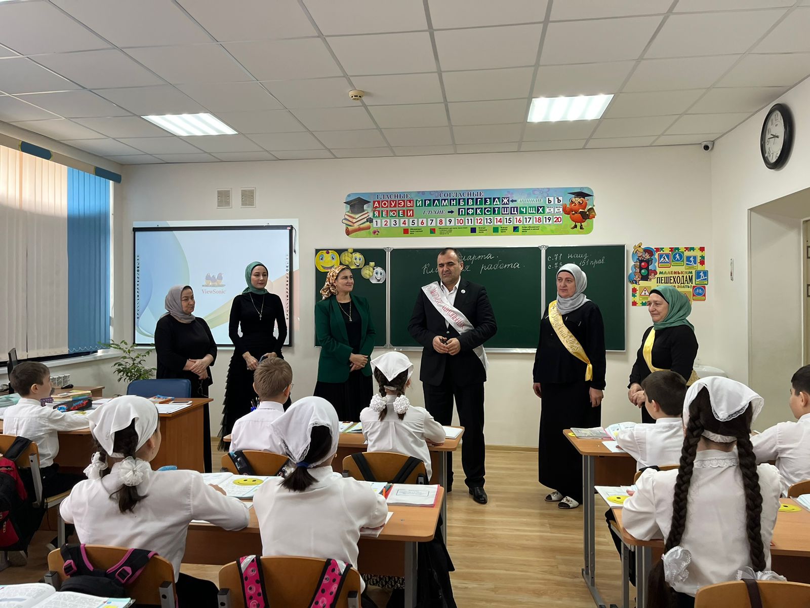 На мероприятие был приглашен выпускник нашей школы, советник министра образования Чеченской Республики Зубхаджиев Магомед-Али Вахаевич, которого встретили его бывшие одноклассницы Манаева Л.Х. и Гиназова Л.Х. - это педагоги и сейчас работающие в данной школе.