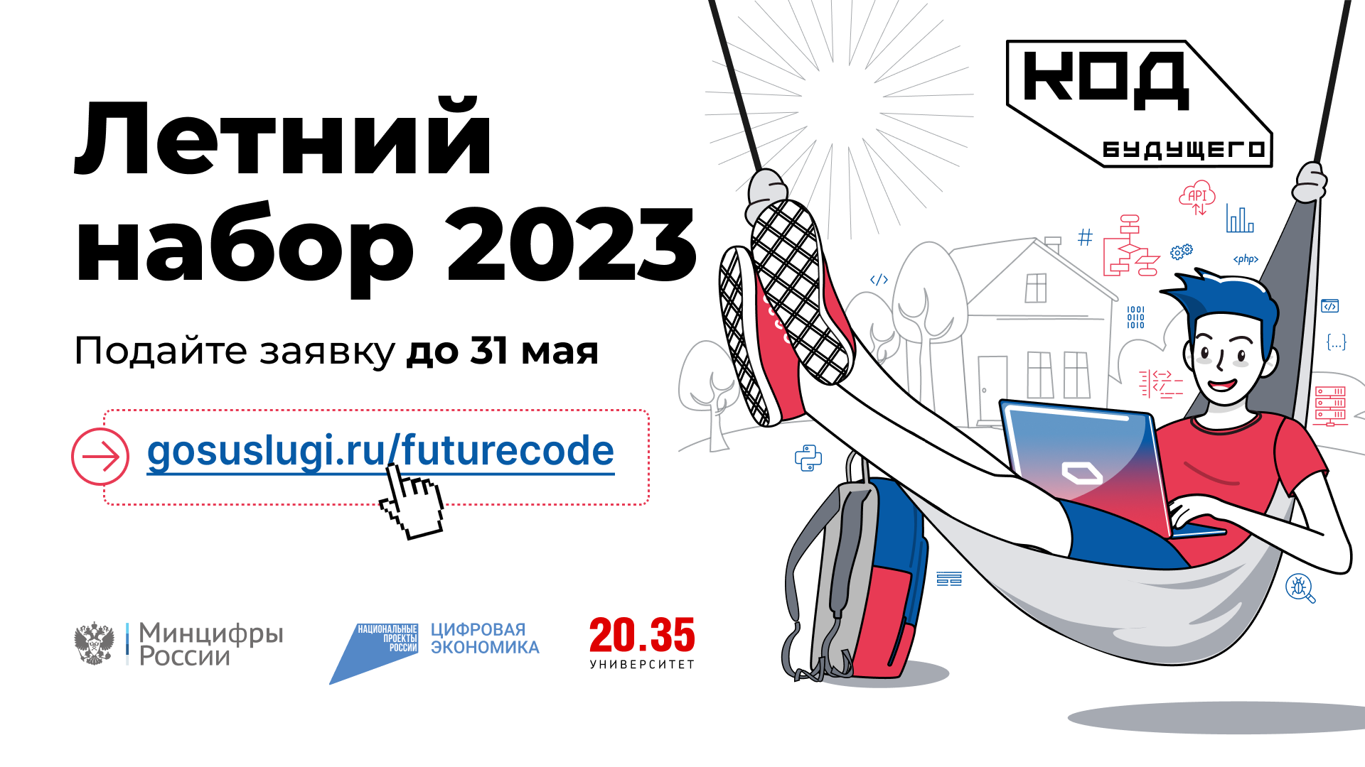 27.04.2023Объявлен набор учащихся 8-11 классов на летние образовательные программы проекта«Код будущего». Благодаря национальному проекту «Цифровая экономика» на летних каникулах школьники смогут бесплатно изучить разработку приложений, сайтов и игр на Python, а также новые языки программирования — PHP, Javascript и другие. Для записи на портале Госуслуг доступны 19 курсов от 12 образовательных организаций, среди которых крупнейшие ИТ-платформы и ведущие ИТ-университеты. Каждый курс состоит из 4 модулей по 36 академических часов. Летом в ускоренном формате можно освоить первые 2-3 модуля, остальные — осенью 2023 года. Успешно сдав экзамены, ребята получат сертификат об окончании курса. Школьники со всей страны могут обучаться онлайн. Очное обучение открыто в следующих регионах: Алтайский, Краснодарский и Красноярский край, Москва, Санкт-Петербург, Московская, Тульская и Челябинская область, ЯНАО. Как записаться на курсы: 1. Выберите курс иподайте заявление на Госуслугах 2. Пройдите вступительное испытание 3. Приступайте к обучению в группе Обучение бесплатное. Программу реализует Минцифры России в рамках проекта «Развитие кадрового потенциала ИТ-отрасли»национального проекта «Цифровая экономика». Оператор проекта — Университет 2035. Прием заявок продлится до 31 мая 2023 года. Успейте записаться: количество мест ограничено! Записаться на курс Справочно: «Код будущего» — уникальный образовательный проект для учеников 8-11 классов: они могут бесплатно изучить современные языки программирования на двухлетних курсах в онлайн и офлайн-формате. Осенью 2022 года на курсы записались и начали учиться более 130 тысяч школьников