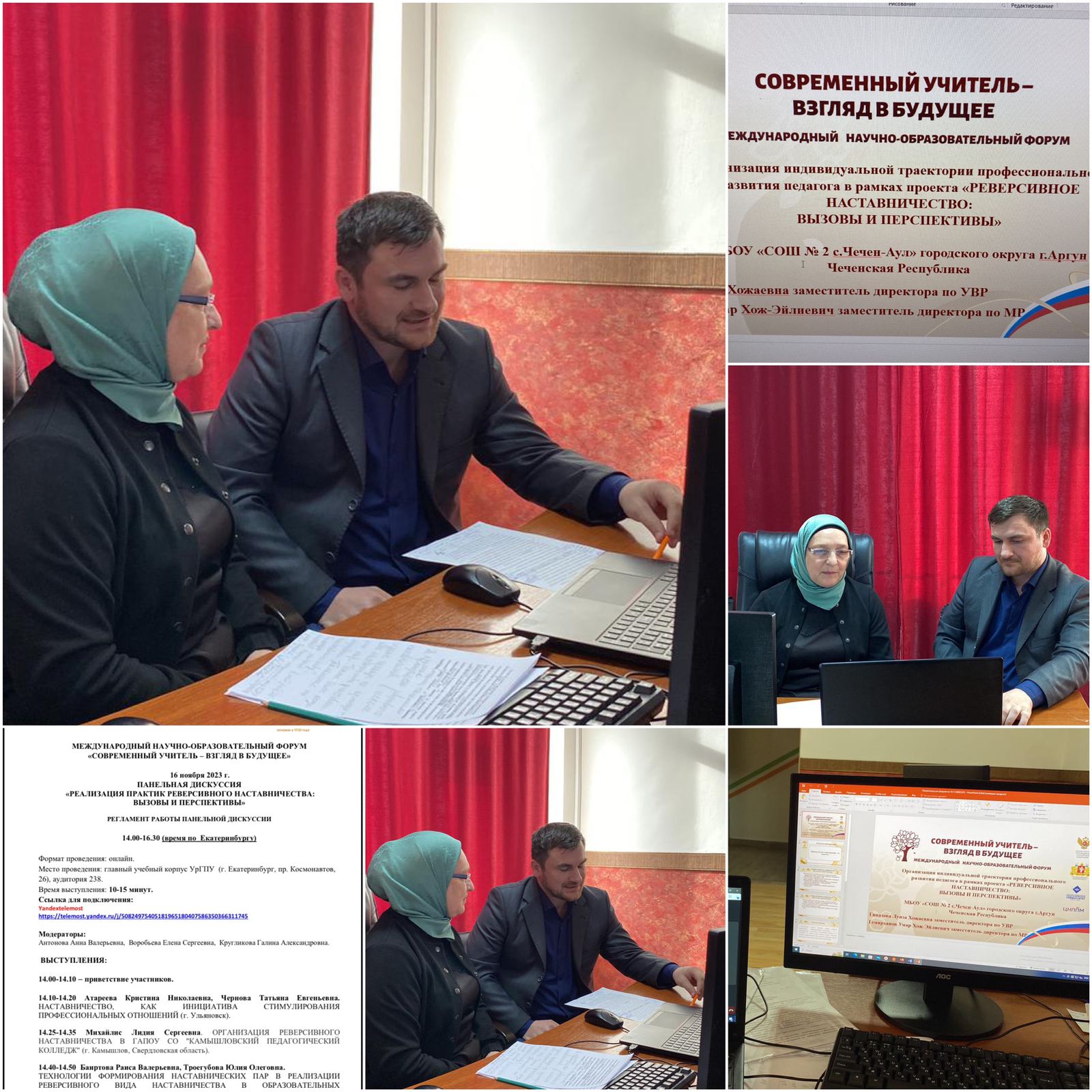 16.11.2023Гиназова Л.Х. заместитель директора по УВР и Гемирханов У.Х-Э. заместитель директора по МР выступили с докладом на международном научно-образовательном форуме «Современный учитель - взгляд в будущее» инициатором которого был Уральский Государственный Педагогоческий Университет г. Екатеринбург. Участниками форума стали педагоги из городов Ульяновск, Тюмень, Севастополь, также Свердловская область, Карачаево-Черкесская Республика.Основной мыслью доклада была идея организации реверсивного наставничества в школе и организация индивидуальной траектории профессионального развития педагога. Докладчики рассказала, что огромную поддержку при работе наставническими парами оказывает Научно-методический центр ЧГПУ в лице Башаевой С.А.